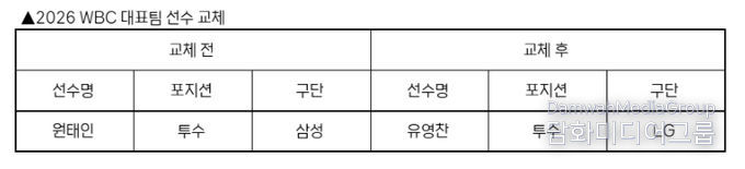 시민행정신문 장규호 기자 | KBO 전력강화위원회는 부상으로 인해 WBC 참가가 어려워진 삼성 원태인을 대체할 선수로 LG 유영찬을 확정하고 WBC 조직위에 선수 교체 승인을 요청했다.