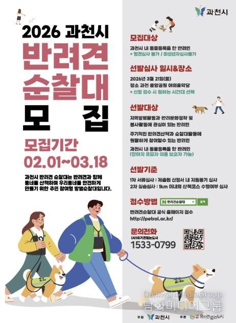 신계용 과천시장은 “반려견 순찰대는 주민이 주도적으로 우리 동네의 안전을 지키는 뜻깊은 활동”이라며, “반려견과 함께 산책도 즐기고 지역 사회에 봉사할 수 있는 이번 모집에 시민 여러분의 많은 관심과 참여를 부탁드린다”라고 전했다.