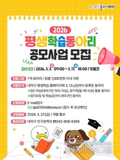 대덕구는 ‘2026년 평생학습 동아리 공모사업’ 참여 동아리를 모집한다고 밝혔다. 지역 주민이 주도하는 학습공동체 활성화와 배움의 생활화를 목표로 한다.
