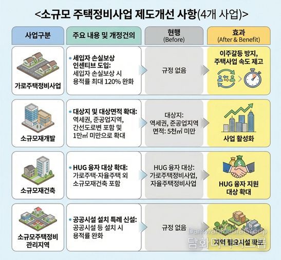 이번 개선 건의는 소규모주택정비사업을 촉진하기 위한 ▴사업 지연 방지(세입자 손실보상 인센티브) ▴사업 활성화 방안(사업 대상 확대, 융자지원) ▴지역 내 필요 시설 확보(공공기여) 등 3개 분야에서 이뤄졌다.