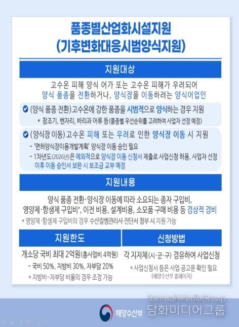 시민행정신문 이세훈 기자 | 해양수산부는 기후변화에 선제적으로 대응하고 어가의 소득 안정을 도모하기 위해 2월 23일부터 3월 31일까지 ‘2026년 기후변화 대응 시범 양식 지원사업’ 대상 어가를 공모한다고 밝혔다.