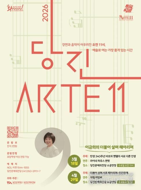 〈당진Arte 11〉 3월 콘서트 - 이금희의 더불어 살며 헤아리며 Ⅰ은 ‘탄생 340주년 바흐와 헨델의 서로 다른 인생’을 주제로 진행된다. 소통의 아이콘 이금희 아나운서가 해설을 맡아, 같은 시대를 살았지만 전혀 다른 삶의 궤적을 걸은 두 작곡가의 음악과 이야기를 들려준다. 연주는 라이네 하우스 퀸텟이 맡아, 바이올린 김윤경‧조혜수, 비올라 이화진, 첼로 강미사, 피아노 원종호가 함께 무대에 오르며, 강연과 음악이 자연스럽게 어우러지는 렉쳐 콘서트를 선보일 예정이다.
