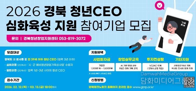 시민행정신문 이세훈 기자 | 경상북도는 창업 초기 청년기업의 안정적인 정착과 성장을 지원하기 위해 오는 3월 13일까지 ‘2026 경북 청년CEO 심화육성 지원사업’참여 기업 40개사를 모집한다.
