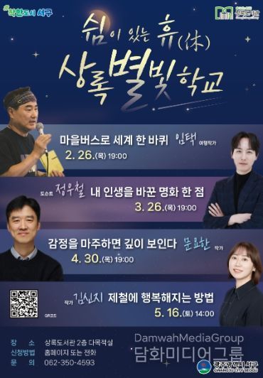김선아 도서관과장은 “상록별빛학교는 단순한 강연을 넘어 주민이 스스로를 돌보고 쉼을 경험하도록 기획한 프로그램”이라며 “책과 사람, 이야기가 만나는 상록별빛학교에 많은 관심과 참여를 바란다”고 말했다.