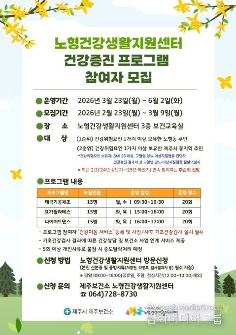 시민행정신문 기자 | 제주보건소 노형건강생활지원센터는 2월 23일부터 3월 9일까지 지역주민의 건강위험요인 개선을 위한 건강증진 프로그램 참여자를 모집한다.