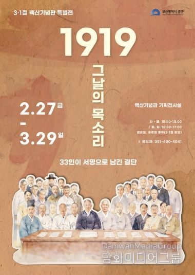 시민행정신문 기자 | 부산 중구는 제107주년 3·1절을 맞아 오는 2월 27일부터 3월 29일까지 백산기념관 기획전시실에서 '1919 그날의 목소리, 33인이 서명으로 남긴 결단'특별전을 개최한다.