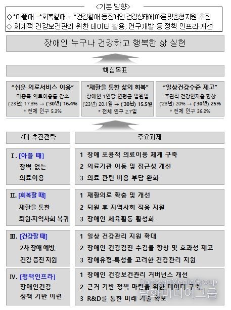 이에 정부는 장애인단체, 의료전문가 등 이해관계자의 의견수렴을 거쳐, ▲장벽 없는 의료이용, ▲재활을 통한 퇴원·지역사회 복귀, ▲2차 장애 예방, 건강 증진 지원, ▲장애인건강 정책 기반 마련을 중점전략으로 하여 12대 주요과제 및 32개 세부 추진과제를 제시했다.