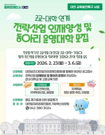 시민행정신문 강갑수 기자 | 대전시는 교육발전특구 사업의 일환으로‘고교-대학 연계 전략산업 인재 양성’및‘고교-대학 연계 동아리 운영’사업에 참여할 관내 대학을 모집한다.