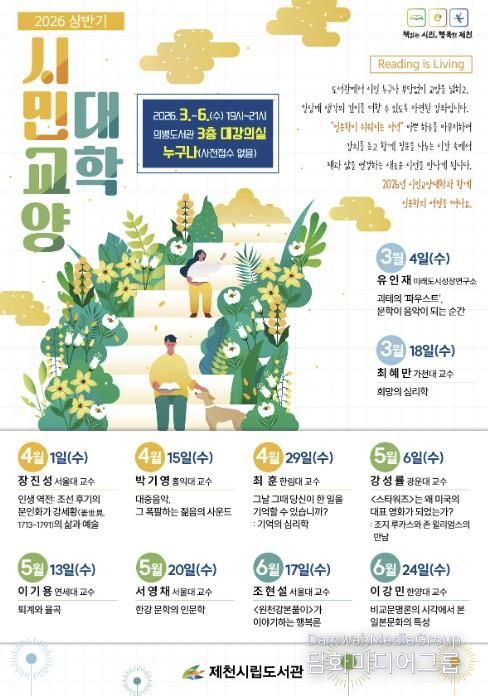시민행정신문 강갑수 기자 | 제천시립도서관은 시민이 일상에서 인문학을 쉽게 접하고 삶을 성찰할 수 있도록'2026 상반기 시민교양대학'을 운영한다.