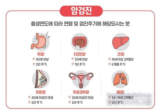 검진 대상과 주기는 ▲위암(40세 이상, 2년 주기) ▲대장암(50세 이상, 매년) ▲간암(40세 이상 고위험군, 6개월 주기) ▲유방암(40세 이상 여성, 2년 주기) ▲자궁경부암(20세 이상 여성, 2년 주기) ▲폐암(고위험군 대상) 등이다.