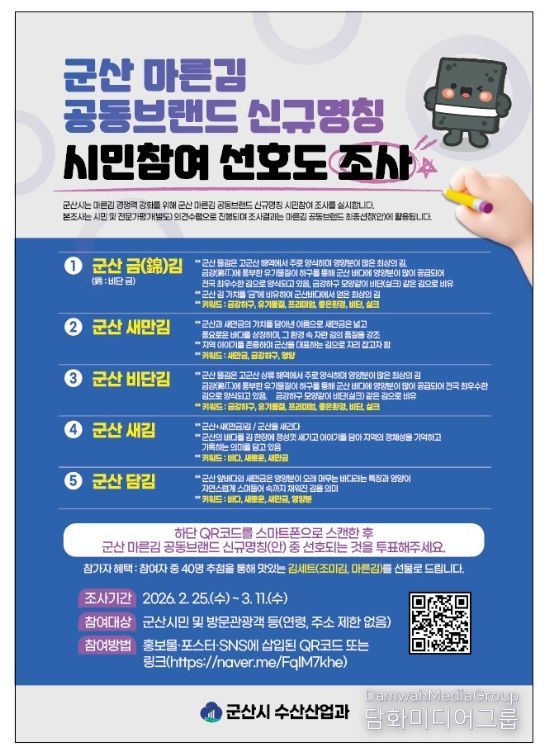 시민들은 포스터 내 QR코드 또는 온라인 링크를 통해 조사에 참여할 수 있으며, 참여자 중 40명을 추첨해 김 세트(조미김·마른김)를 증정할 예정이다.