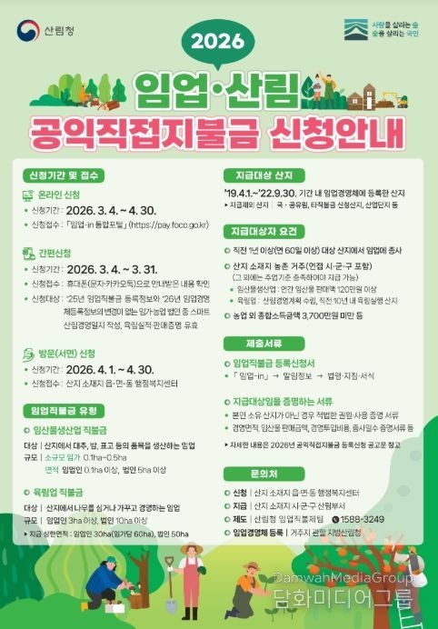 시민행정신문 김학영 기자 | 북부지방산림청은 '2026년 임업·산림 공익직접지불금' 신청을 3월 4일부터 4월 30일까지 접수한다고 밝혔다.