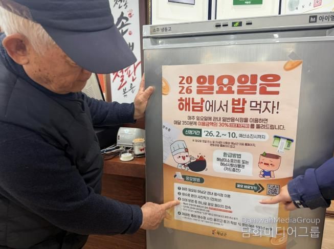 한편 해남군은 이번 사업의 성공적인 안착을 위해 관내 일요일 영업 음식점 업주들의 적극적인 협조를 요청했다. 군 관계자는“식당을 찾는 손님들이 이 혜택을 놓치지 않도록 계산대나 식탁에 홍보물을 비치하는 등 적극적인 안내를 부탁드린다”며, “업주분들의 친절한 서비스와 홍보가 더해진다면 일요일 외식 문화가 정착되어 침체된 골목상권이 다시 살아나는 계기가 될 것”이라고 전했다.