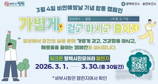 시민행정신문 기자 | 평택시는 오는 3월 4일 ‘비만 예방의 날’을 맞아, 3월 한 달간 시민과 함께하는 ‘가볍게 걷고, 마시고 줄이자’ 합동 캠페인을 대대적으로 전개한다고 밝혔다.