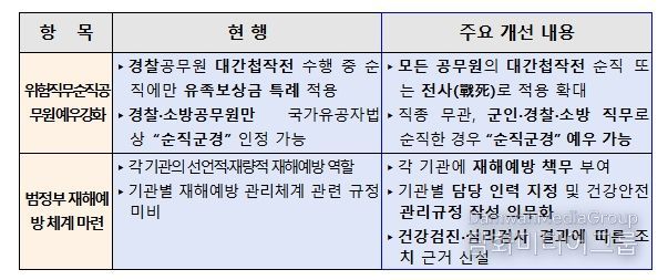 경찰·소방이 아닌 공무원도 군인, 경찰, 소방의 직무로 순직(위험직무)한 경우, '국가유공자법'상 순직군경으로 예우할 수 있도록 절차와 근거도 마련된다.
