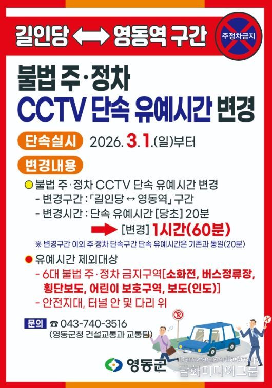 군에 따르면 3월 1일부터 『길인당↔영동역』 구간의 불법 주·정차 CCTV 단속 유예시간이 기존 20분에서 1시간(60분)으로 변경된다.