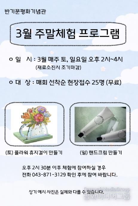 시민행정신문 강갑수 기자 | 음성군 제8대 유엔사무총장 반기문 평화기념관에서는 관람객을 위한 3월 주말 무료 체험 프로그램을 운영한다.