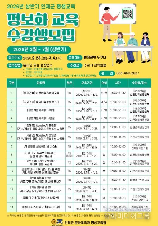 시민행정신문 강갑수 기자 | 인제군이 군민의 디지털 역량 강화를 위해 ‘2026년 상반기 인제군 평생교육 정보화 교육과정’ 수강생을 모집한다.