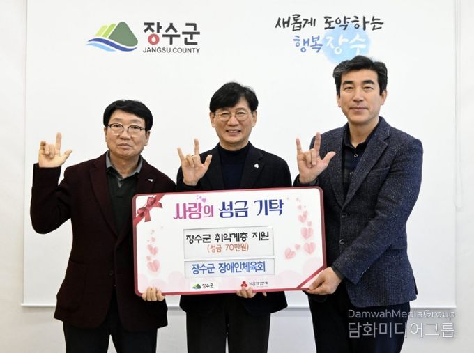 최훈식 군수는 “지역사회를 위한 뜻깊은 나눔에 함께해 주신 장수군 장애인체육회에 깊이 감사드린다”며 “기탁해 주신 성금은 도움이 꼭 필요한 이웃들에게 소중히 전달해 생활 안정에 보탬이 되도록 하겠다”고 밝혔다.