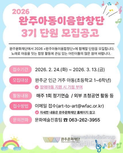 시민행정신문 강갑수 기자 | (재)완주문화재단은 오는 2월 24일부터'완주아동이음합창단'3기 단원 30명을 공개 모집한다고 밝혔다.