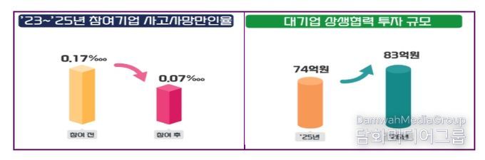 대기업과 정부의 지원을 받은 사업장은 안전한 일터로 거듭나고 있다. 지난 3년간 사업에 참여한 기업 10,453곳의 평균 사고사망만인율은 0.07‱로 참여 이전(0.17‱)보다 절반 이하로 감소했다.