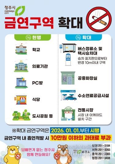 시는 공공장소 내 간접흡연 피해를 최소화하기 위해 ‘청주시 금연구역 지정 및 간접흡연 피해방지 조례’를 개정하고 올해 1월부터 금연구역을 확대했다.