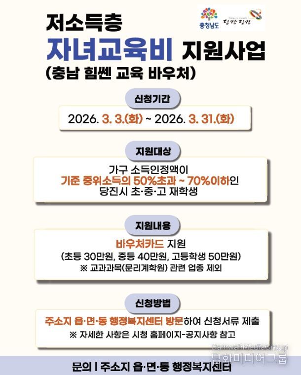 시민행정신문 기자 | 당진시가 오는 3월 3일부터 당진시에 주민등록을 둔(학생 또는 보호자) 초중고 자녀를 대상으로 저소득층 자녀교육비 지원(충남 힘쎈교육바우처)사업을 추진한다고 26일 밝혔다.