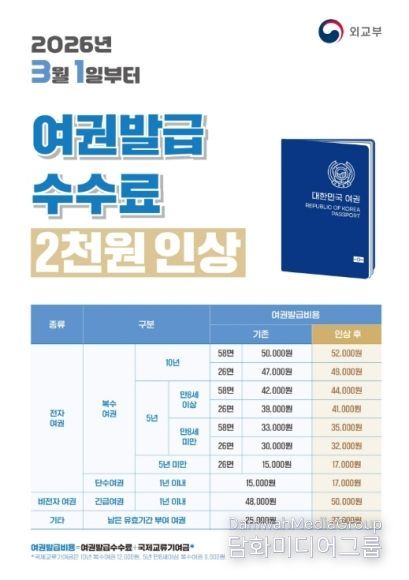 외교부가 지난 2005년 이후 20년 동안 물가 안정을 위해 동결해 왔으나, 차세대 전자여권의 제작단가 상승 등으로 내달 1일부터 2,000원을 인상한다는 방침에 따른 것이다.