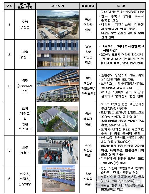 현재는 전체 국공립 초‧중등학교의 약 34.6%에 태양광 설비가 보급되어 있으나, 설치가 곤란한 소규모학교와 노후학교를 제외하면 이번 사업을 통해 사실상 전체 국공립 초‧중등학교가 태양광 발전 설비를 갖추게 된다.