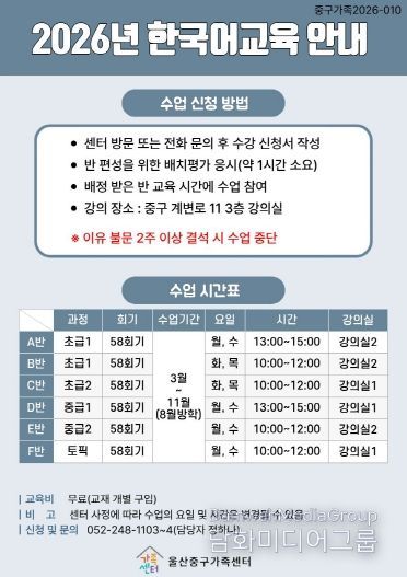 시민행정신문 강갑수 기자 | 울산중구가족센터(센터장 서선자)가 2026년 결혼이민자 역량강화 지원사업의 일환으로 ‘한국어 교육 과정’을 운영한다.