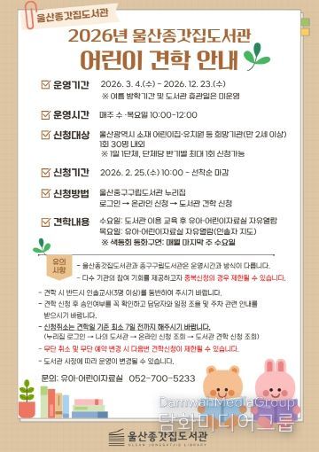 울산종갓집도서관 관계자는 “아이들이 도서관을 편안하고 친근한 공간으로 인식하고 책과 친해지는 계기가 되길 바란다”며 “관심 있는 어린이집 및 유치원의 많은 관심과 참여를 바란다”고 밝혔다.