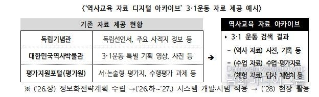 또한, 학생의 탐구 역량을 키우는 역사 수업 활성화를 위해 ‘탐구 중심 역사 교육과정 운영 사례집’(’26. 3종→’27. 9종)을 개발·보급한다. 더불어, 각종 기관·누리집(플랫폼) 등에 분산된 근현대 사료와 교육자료, 체험 자료 등을 수업에 즉시 활용할 수 있도록 교사에게 묶음(패키지) 형태로 제공하는 ‘역사교육 자료 아카이브’를 구축(ʹ27)할 예정이다.