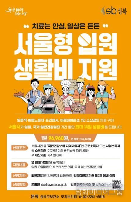 시민행정신문 이존영 기자 | 서울시 성북구보건소가 아파도 생계 부담으로 치료를 미루는 성북구민을 대상으로 ‘서울형 입원 생활비 지원 사업’을 시행하고 있다.