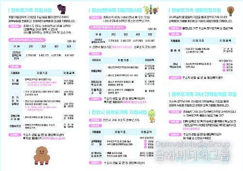 이 외에도 △자녀학습비 및 월동비 지원 △취약·위기가족 사례관리 △한부모가족복지시설을 통한 보호 및 자립 지원 등 천안시와 정부가 추진하는 주요 복지 정보가 수록됐다.