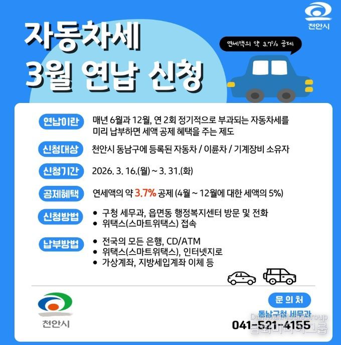 신청 대상자는 천안시 동남구에 등록된 모든 차량 소유자로, 기간 내에 신청해야 할인 혜택을 받을 수 있다.