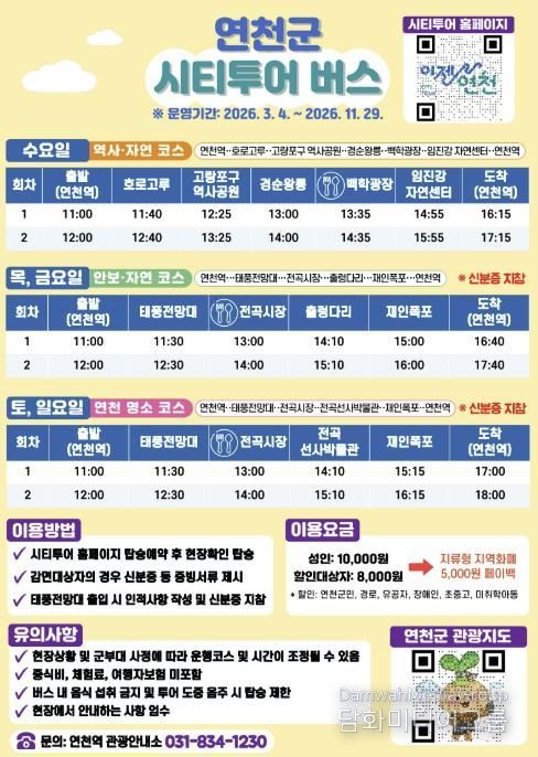 시민행정신문 강갑수 기자 | 연천군이 오는 3월 4일부터 ‘2026년 연천 시티투어 버스’를 재운행한다. 운영 기간은 11월 29일까지다.