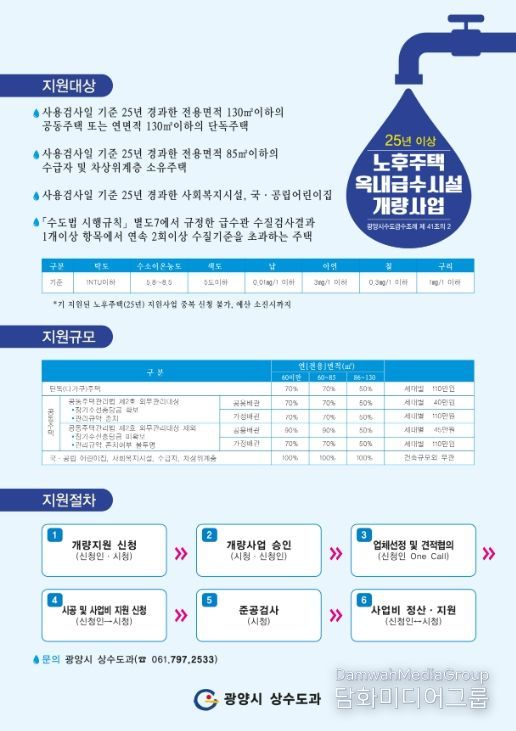 광양시 관계자는 “노후 옥내급수시설 개량사업을 지속 추진하여 시민들에게 안전하고 깨끗한 수돗물을 공급하겠다”며 “많은 시민이 신청해 맑고 깨끗한 수돗물을 이용할 수 있도록 최선을 다하겠다”고 밝혔다.