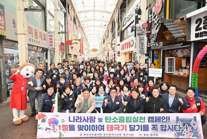 이날 김영길 중구청장과 박경흠 중구의회 의장, 이성룡 울산시의회 의장, 한국자유총연맹 울산중구지회 회원 등 100여 명은 주민들에게 태극기를 나눠주며 3.1절 태극기 게양을 독려했다.