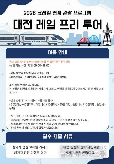 시민행정신문 이세훈 기자 | 대전시는 코레일을 이용하여 대전을 방문하는 외래 관광객을 대상으로 여행용 차량과 기사를 지원하는‘2026년 코레일 연계 관광 프로그램’을 3월부터 운영한다.