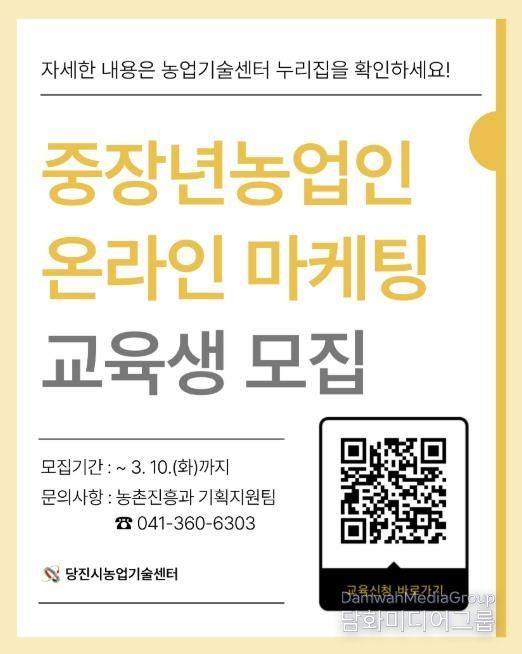 시민행정신문 강갑수 기자 | 당진시는 농산물 온라인 판로 확대와 디지털 역량 강화를 위해 ‘중장년농업인 온라인 마케팅 교육’ 교육생을 모집한다고 4일 밝혔다.