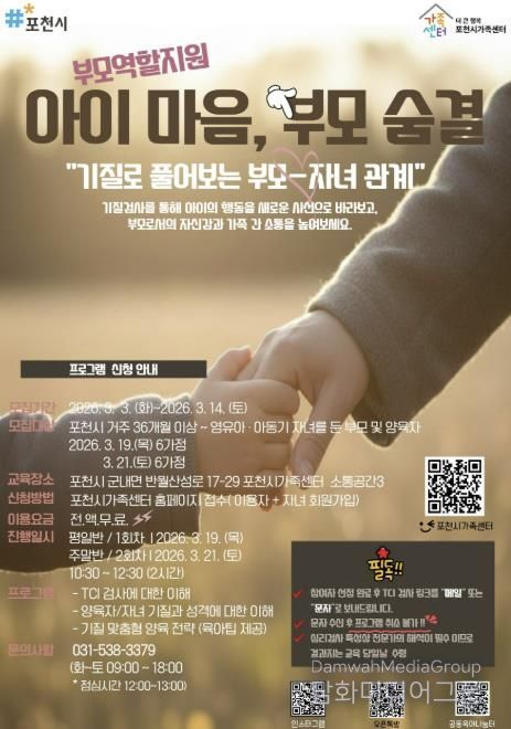 시민행정신문 강갑수 기자 | 포천시 ‘더 큰 행복 포천시가족센터’는 부모와 자녀의 기질을 이해하고 건강한 가족관계 형성을 지원하기 위해 부모-자녀 기질 검사 프로그램인 ‘아이 마음, 부모 숨결’을 오는 3월 19일과 21일 이틀간 운영한다.