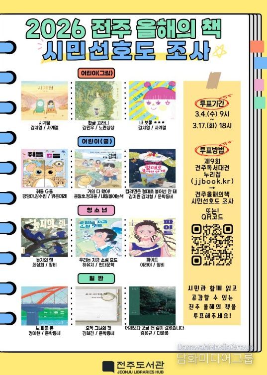 시는 오는 17일까지 약 2주간 2026년 한 해 동안 시민과 함께 읽고 공감할 ‘2026 전주 올해의 책’ 최종 선정을 위한 온라인 시민 투표를 진행한다고 4일 밝혔다.