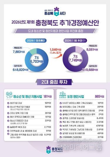 충북도는 재정여건이 어려운 상황이나, 당초예산 편성 시 예측하지 못한 도민 체감형 위주의 사업과 상반기 추진이 시급한 현안사업을 위해, 교육청과 재산이관 수입 및 보조금 등을 활용해 추경 예산을 편성했다.