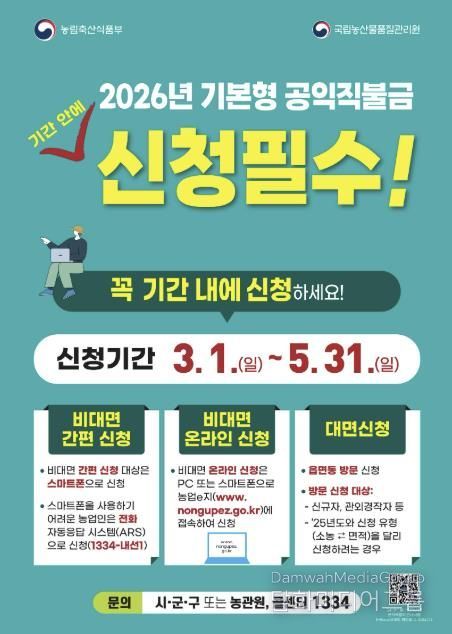 비대면 간편신청 대상자는 지난해 공익직불금 등록정보와 올해 농업경영체 등록 정보에 변동이 없는 농업인이다. 해당 농업인에게는 농림축산식품부에서 스마트폰을 통해 문자로 사전 안내할 예정이다.