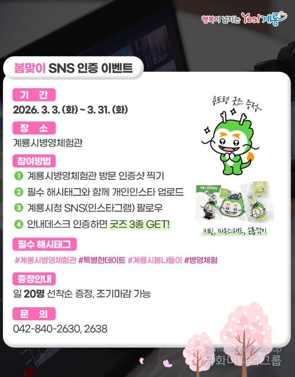 시민행정신문 강갑수 기자 | 충남 계룡시가 3월 한달 간 계룡병영체험관을 찾는 시민과 관광객을 대상으로 ‘봄맞이 SNS 인증 이벤트’를 진행한다.
