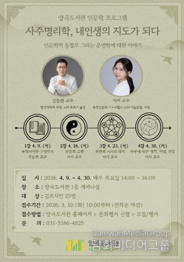 시민행정신문 기자 | 김포시 양곡도서관은 오는 4월 9일부터 4월 30일까지 매주 목요일, 인문학 강좌 '사주명리학, 내 인생의 지도가 되다'를 운영한다.