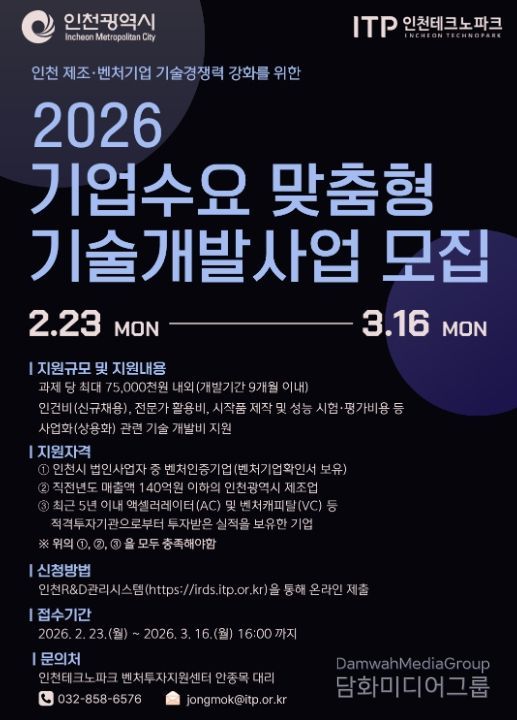 시민행정신문 이세훈 기자 | 인천테크노파크(인천TP)는 지역 제조벤처기업의 기술경쟁력 강화를 위해 ‘2026년 기업수요 맞춤형 기술개발사업’의 참여기업을 오는 3월 16일까지 모집한다고 밝혔다.