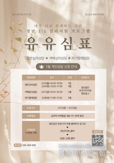 시민행정신문 조규호 기자 | 부평구 청년공간 유유기지 부평은 청년 마음 건강 회복을 위한 심리지원 프로그램 ‘유유심(心)표’의 3월 참여자를 모집한다.