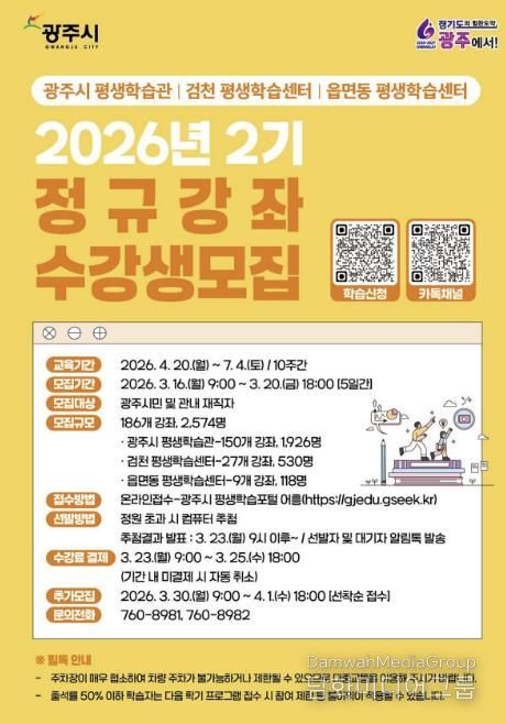 시민행정신문 강갑수 기자 | 광주시는 오는 16일부터 20일까지 2026년 제2기 평생학습 프로그램 수강생을 모집한다고 6일 밝혔다.