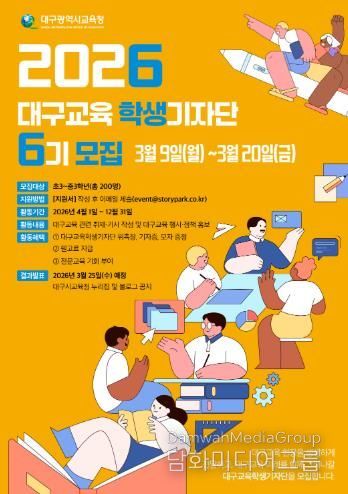 시민행정신문 기자 | 대구시교육청은 3월 9일부터 20일까지 2주간 대구교육의 주요 정책과 각종 소식을 생동감 있게 전하는 대구교육의 홍보대사 역할을 할‘2026년 대구교육기자단’을 모집한다고 밝혔다.